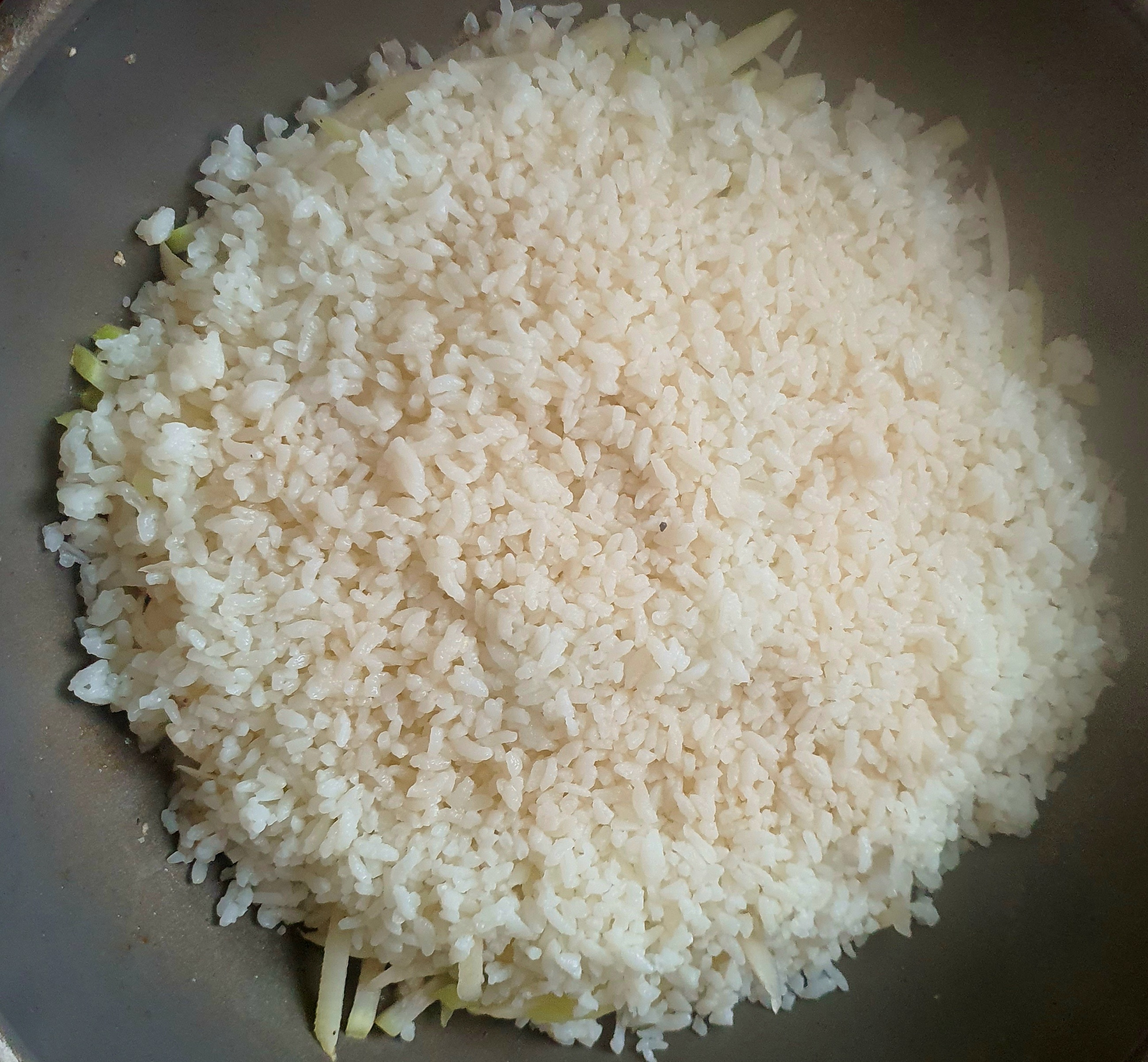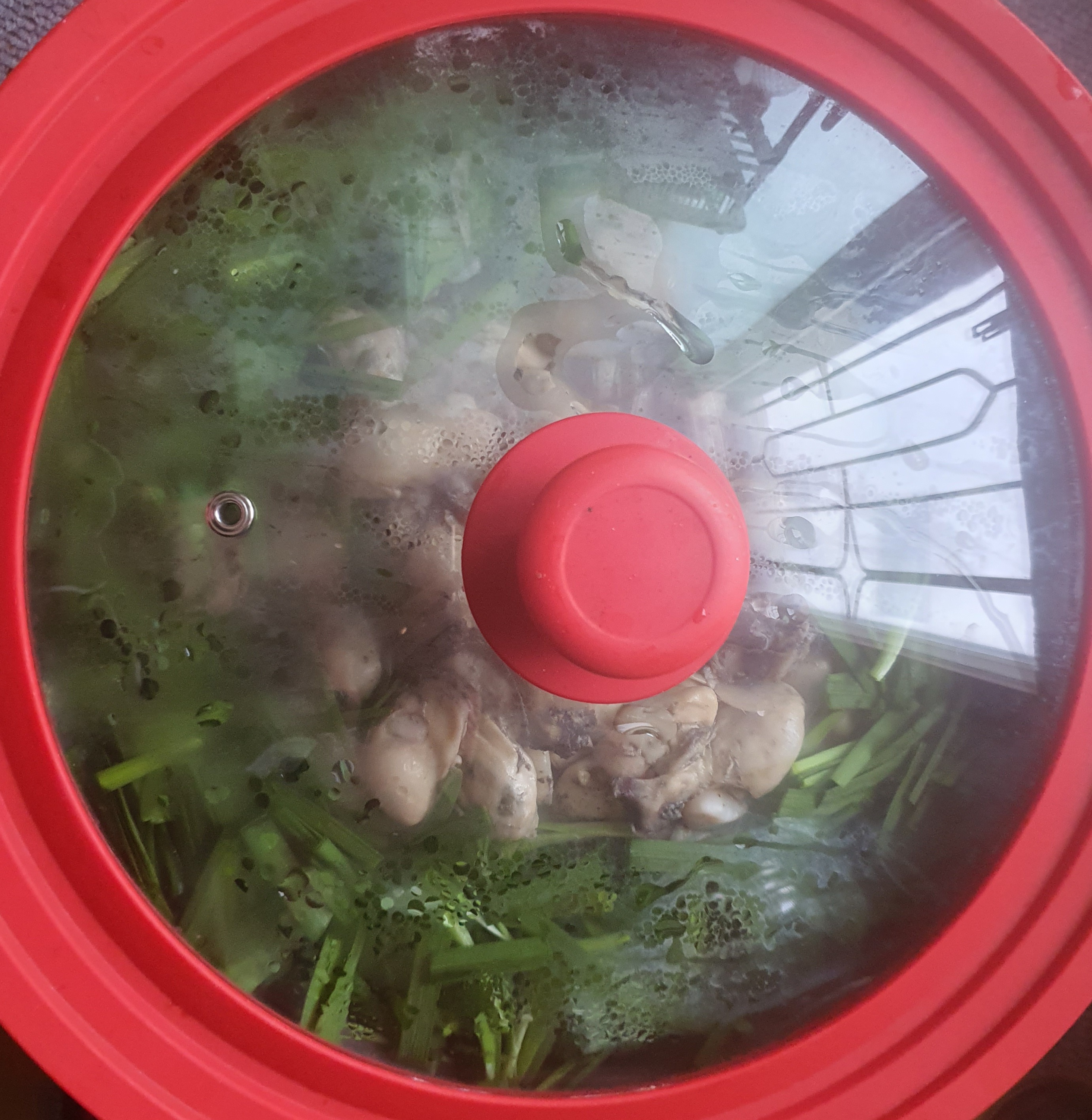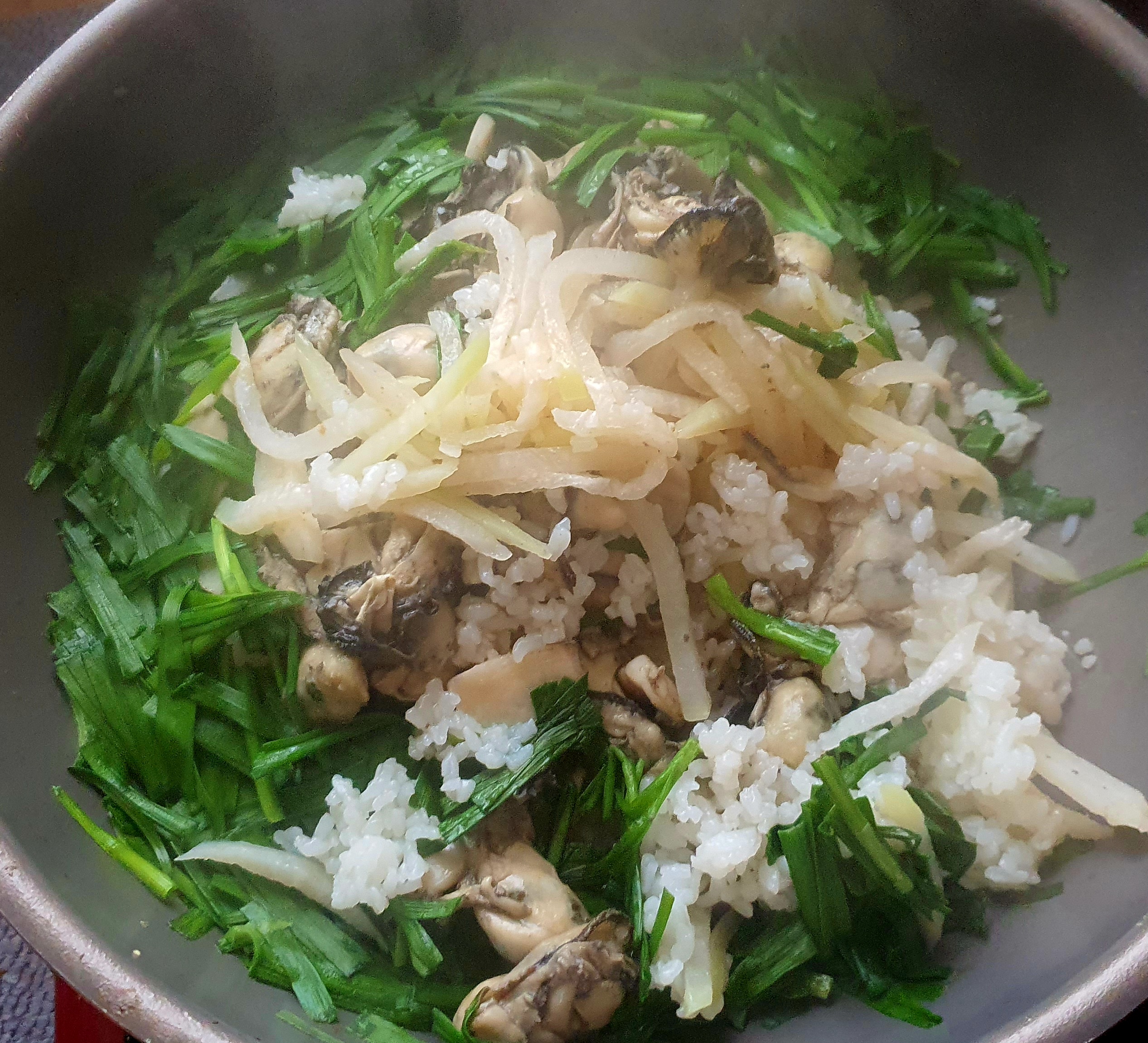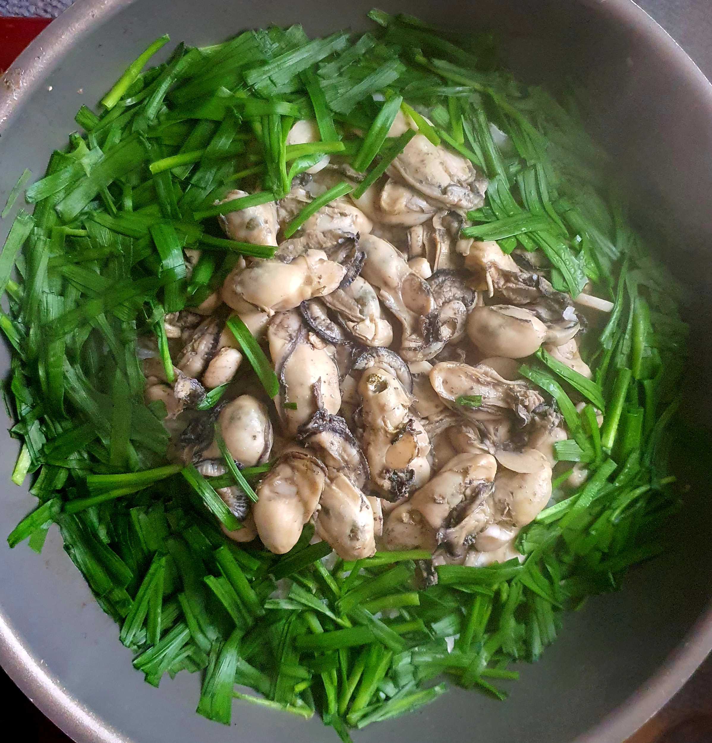 • 불을 약불로 줄이고 밥위에 볶은굴을 올리고 주위에 부추를 둘러주고 다시 뚜껑을 덮고 1분정도 다시 끓여준다.