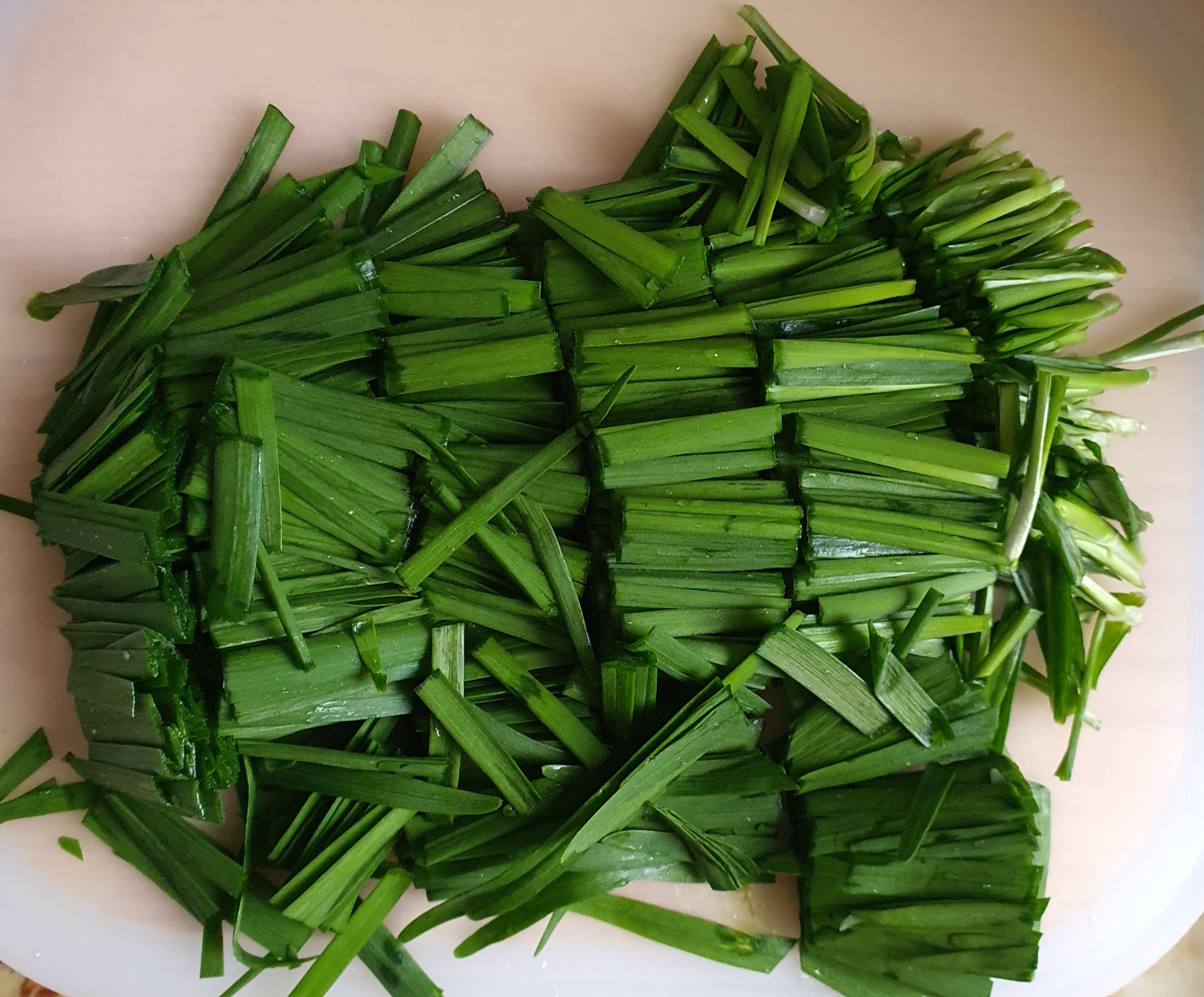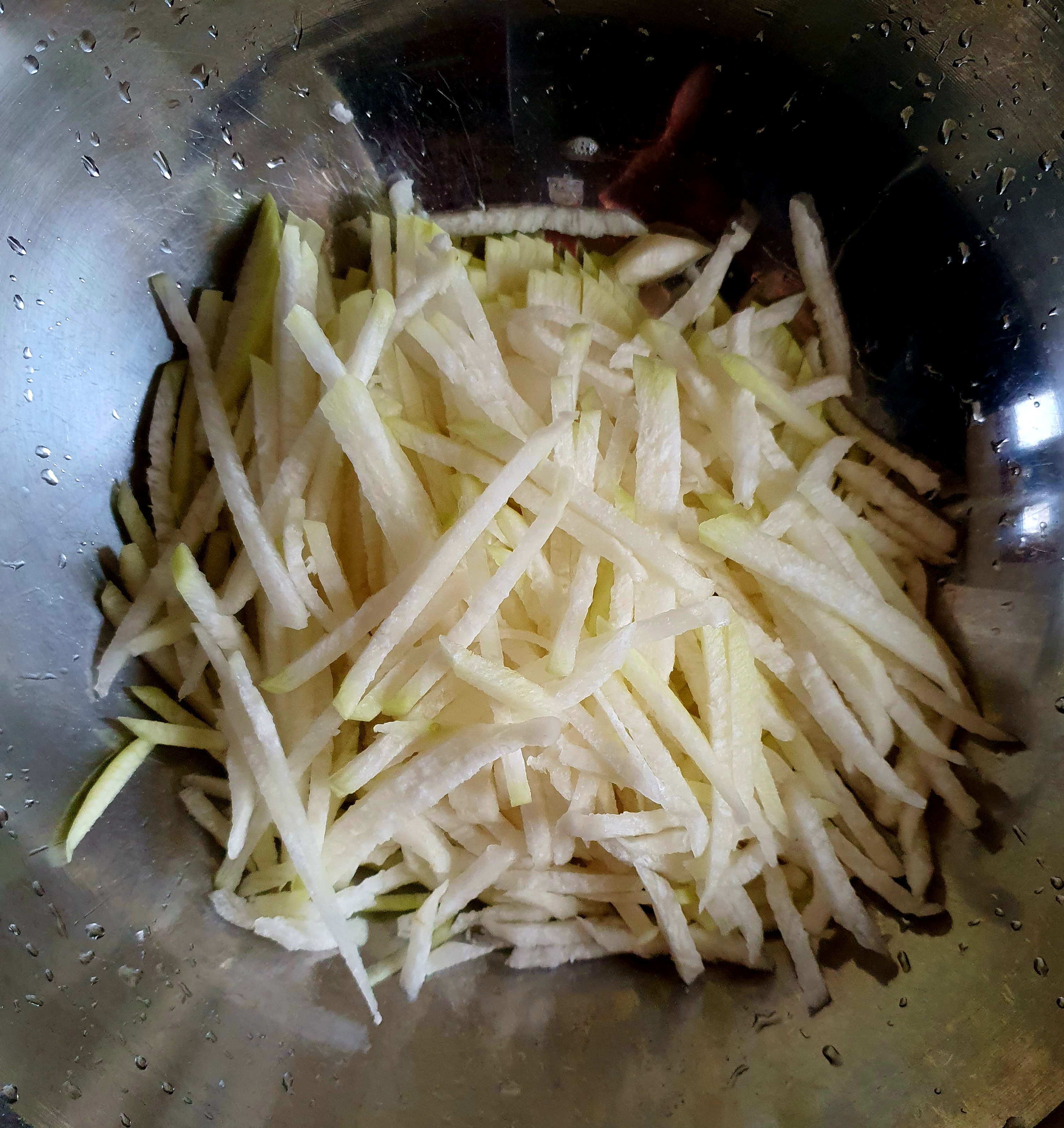 • 무는 채 썰어서 준비한다. 부추는 2~3cm로 썰어 준비한다.