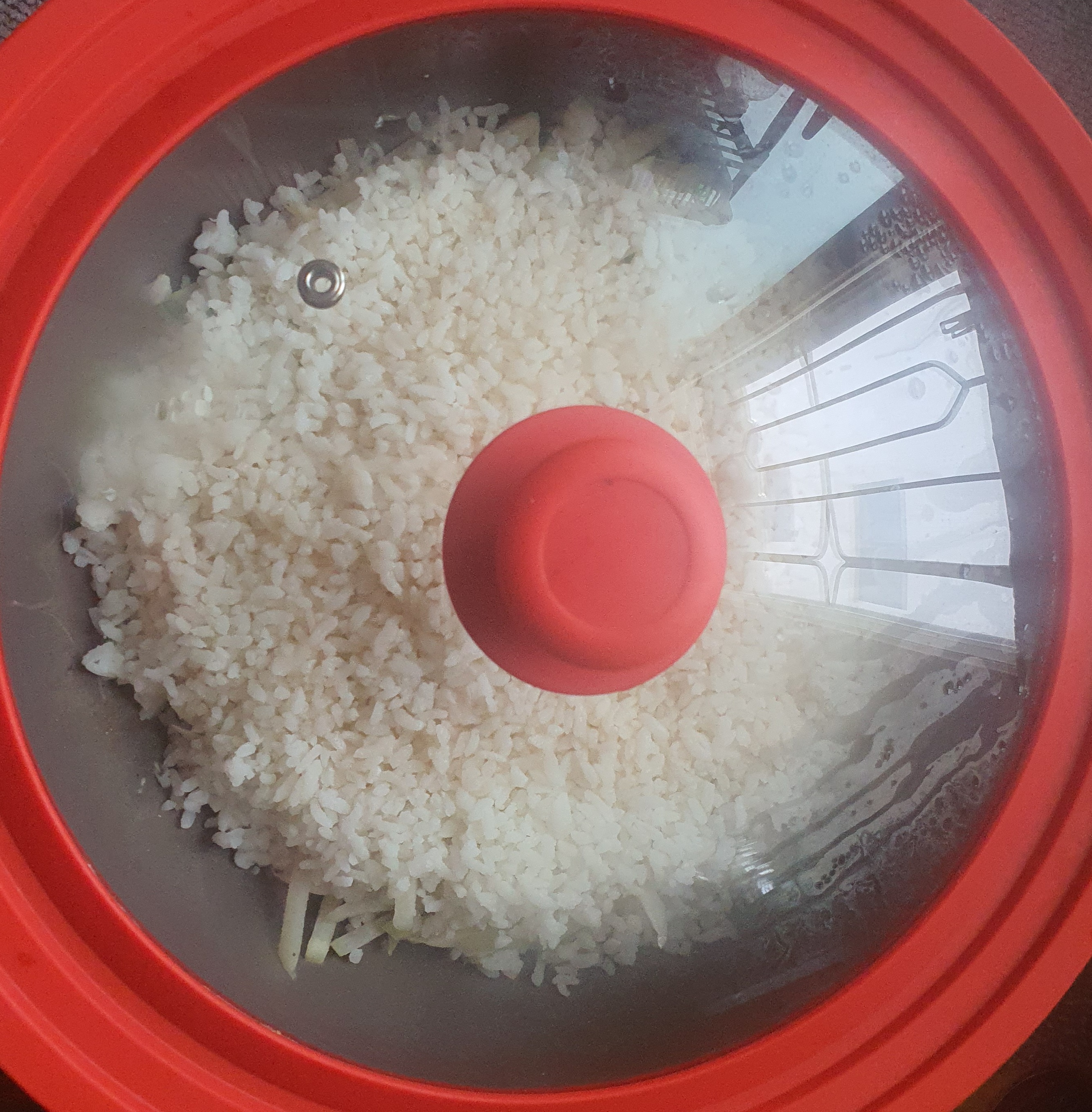 • 뚜껑을 열고 즉석밥을 무위에 넓게 펼쳐준 다음 위에 덜어낸 굴에서 나온 국물을 뿌려주고 뚜껑을 덮고 중불에서 2분정도 끓여준다.