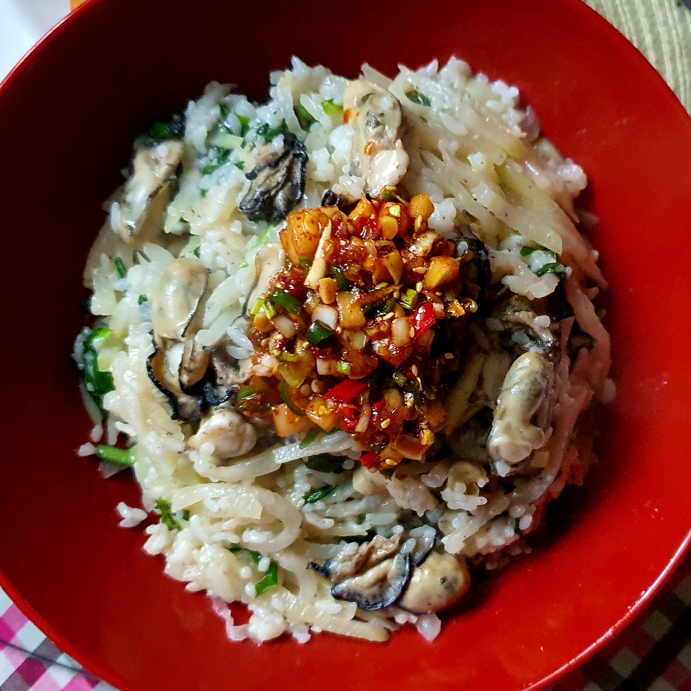■ 재료 : 생굴 300g 1봉. 즉석밥 300g 1개. 무 1컵. 부추 1컵. 다진마늘 ½큰술. 올리브유+참기름. 소금